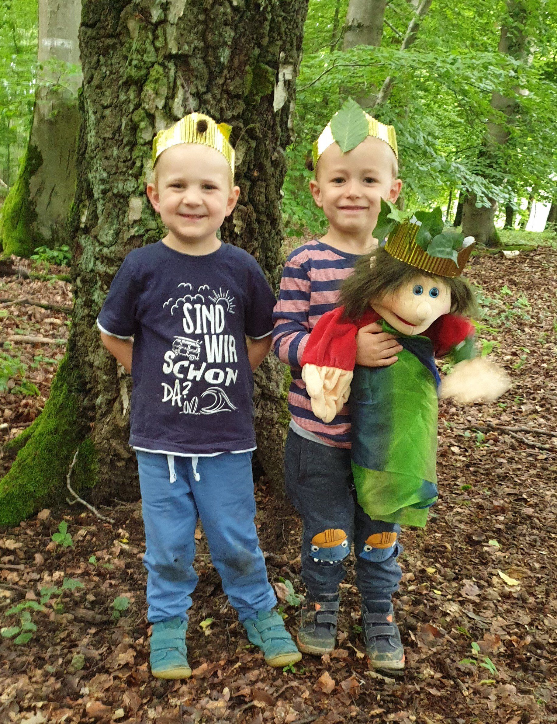 Ab Juni trafen sich einmal im Monat die 2,5-4jährigen Waldentdecker am Gimbacher Hof, um mit Müttern, Vätern, Stefanie Berger und einem vollgepackten Bollerwagen in den Wald zu ziehen. Dort angekommen gab es ein großes Lager aus Picknickdecken, es wurde gesungen, gespielt, gebastelt und geforscht. Besucht wurden wir dabei z.B. von einer Raupe, die zum Schmetterling wurde, von Igel Emil und einmal sogar von der Waldkönigin Silva (im Foto ganz rechts), mit der die Kinder großzügig ihre gesammelten Natur-Schätze teilten. Als Dank durften sie sich dann auch Wald-Kronen und –Armbänder basteln und sich die auf wundersame Weise in der Schatztruhe erschienenen Goldtaler teilen.