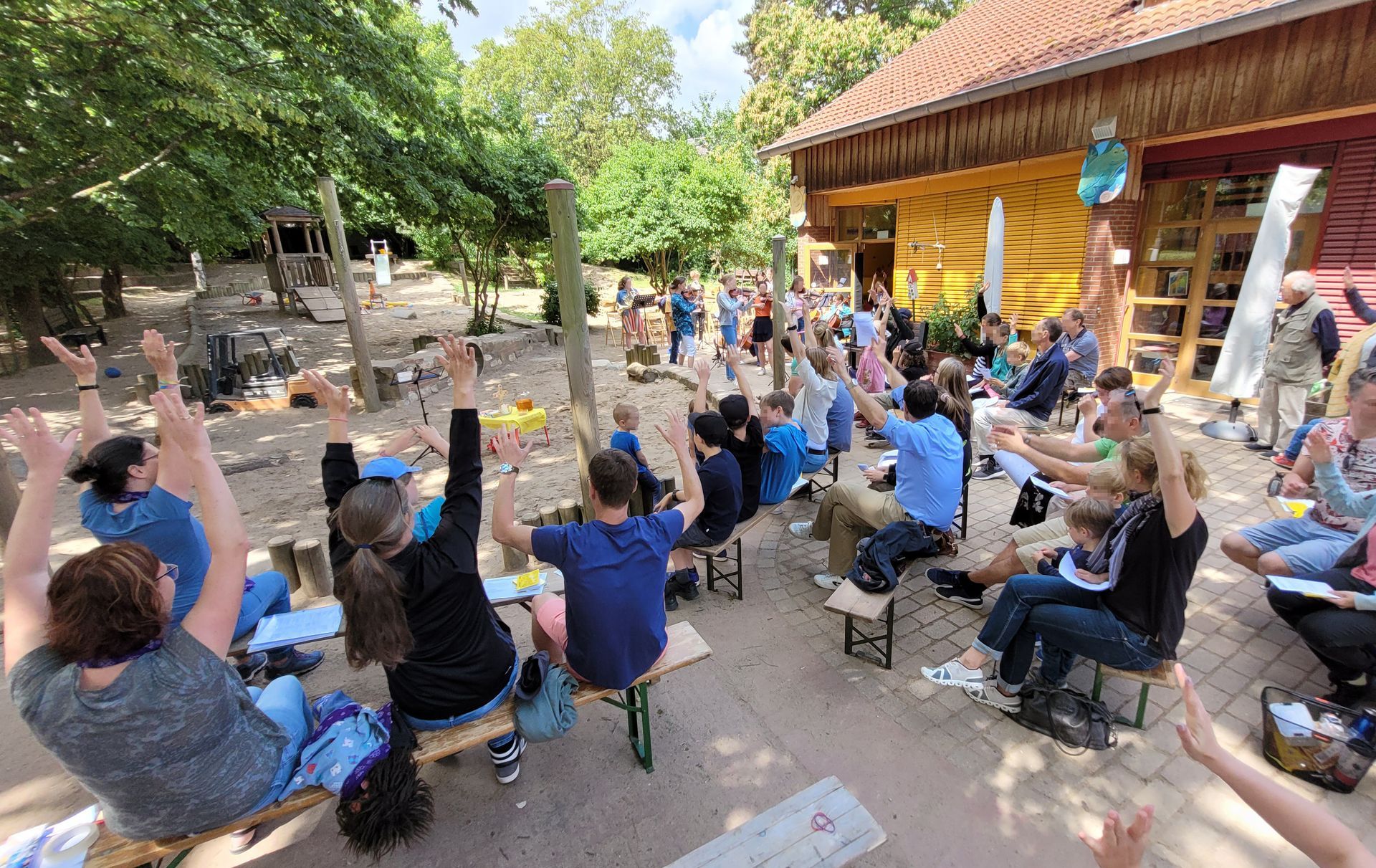 „Viele kleine Leute an vielen kleinen Orten, die viele kleine Schritte tun, können das Gesicht der Welt verändern“ – alle sangen das Lied lauthals mit, begleitet vom Kinder- und Jugendorchester der Ev. Paulusgemeinde Kelkheim. Rund 70 Kinder, Jugendliche und Erwachsene, von der Zweijährigen bis zum Opa, waren am 2. Juli zur Familienkirche im Außengelände der Ev. Kita Arche Noah gekommen. Das Lied war Programm - da wurde das Gleichnis vom Sauerteig erzählt, der eine Menge Mehl in leckeres Brot verwandelt, und die Geschichte ins Heute „übersetzt“, ein großes Glas Wasser mit etwas Tinte bunt eingefärbt und beim Batiken erlebt, wie wenige Tropfen Farbe sich auf Stoffbeuteln ausbreiten. So, wie sich auch gute Ideen, helfende Hände und ein aufmerksamer Blick für die Bedürfnisse anderer immer weiter ausbreiten können, sei es in der Kita oder der Schule, in der Familie oder in der Gesellschaft ganz allgemein. Als Vertreterin für eine Organisation, die aus einer solchen guten Idee entstanden ist und nun bundesweit rund 120.000 Mitglieder hat, war Dipl. Sozialpädagogin Julia Jakob zu Gast, Leiterin der Frühförderstelle der Lebenshilfe Main-Taunus e.V.. Ihr wurde im Rahmen des Gottesdienstes die Familienkirchen-Kollekte der letzten Monate und dieses Gottesdienstes überreicht, rund 550,- Euro für die Frühförderstelle und den Familienunterstützenden Dienst des Vereins. Im Anschluss gab es ein gemeinsames Picknick und die Möglichkeit, sich am Infostand über die Lebenshilfe Main-Taunus e.V. zu informieren, während die Kinder durch den Spielplatz tobten.
