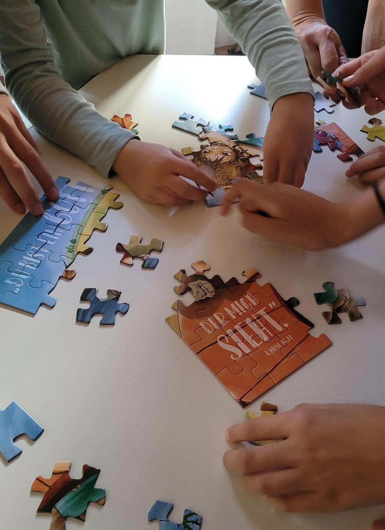 Am Samstag, den 30.September, war Leben im ganzen Gemeindehaus: Nach einem Familienkirchen-Einstieg mit Puzzle-Aktion und Mitmachgeschichte wuselten Kinder, Jugendliche und Erwachsene mit Laufkarten von Raum zu Raum, um auch keine Station zur Geschichte von Hagar und zur Jahreslosung 2023 "Du bist ein Gott, der mich sieht" zu verpassen: Steine bemalen, Sandbilder, kleine Kuchengesichter mit Augen verzieren, Detektivspiele, Experimente, Bibel-Yoga und ein Playmobilfilm warteten auf die Familien. Zum Abschluss kamen dann alle noch einmal in der Kirche zusammen, um den gemeinsamen Vormittag mit einem Quellentanz, Gebet und Segen abzurunden.