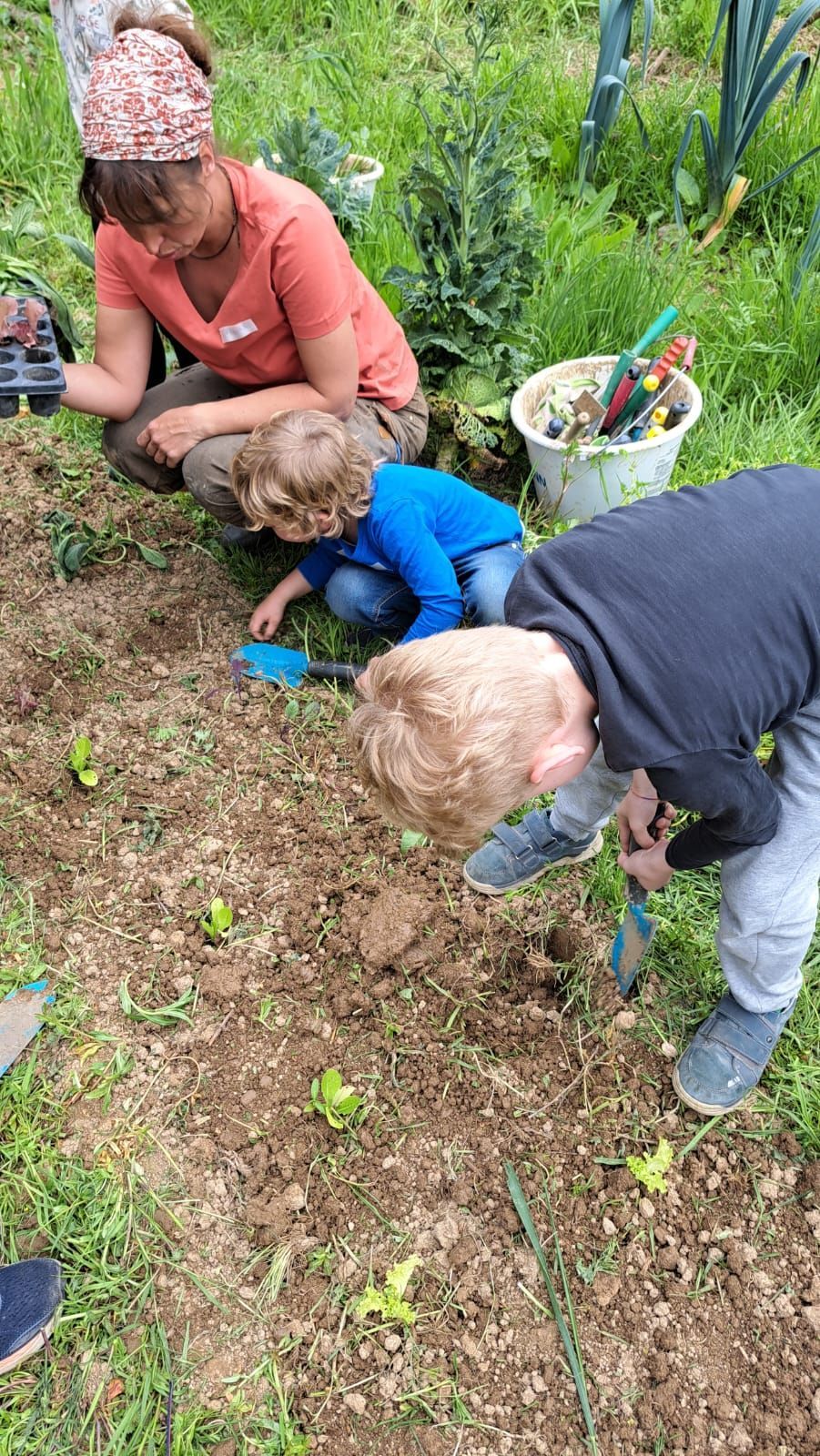 Mit großer Begeisterung wurden Salat und Kohlrabi-Setzlinge gepflanzt. Ob so ein kleiner Salat auch wächst, wenn er in einem armtiefen Loch verbuddelt wird? Anschließend wurde Rosmarin geschnitten, gemörsert und durch den Wolf gedreht. Irgendwann kam der angekündigte Regen, aber auch im Bauwagen konnte gemütlich gewerkelt werden. Jede Familie konnte am Ende ein Glas selbstgemachtes Rosmarinsalz mit nach Hause nehmen.